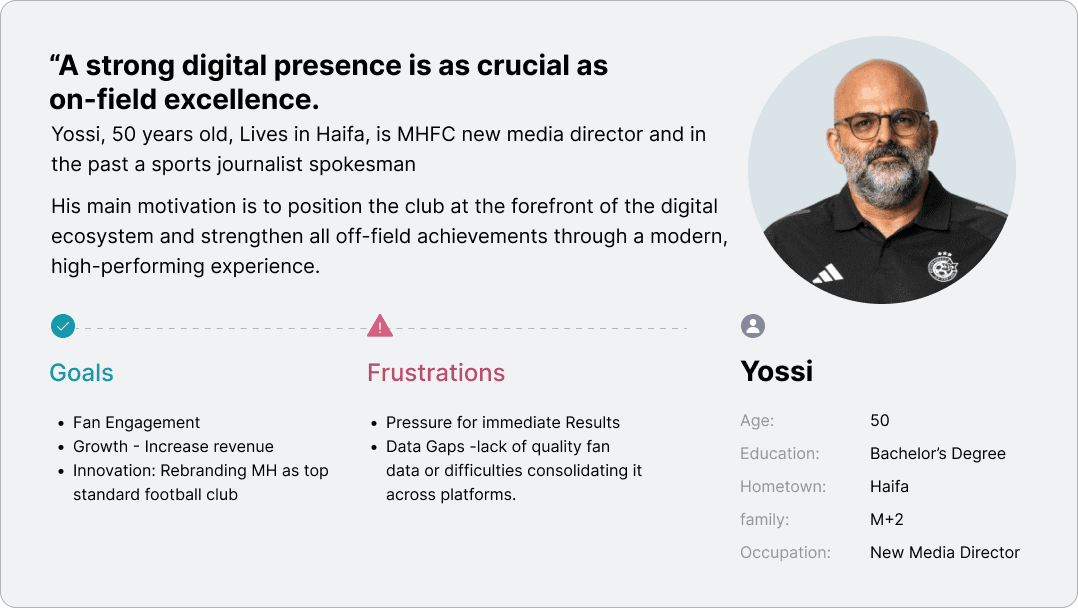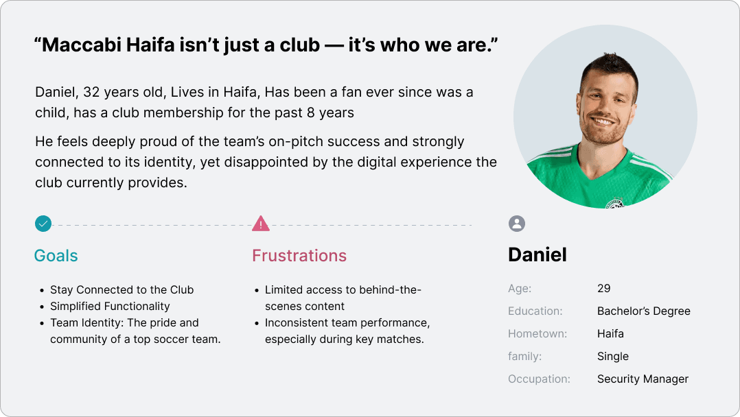 My research was divided into two tracks. The first focused on the user : mapping their behaviours, journey, emotional triggers, pain points, and the challenges they encountered across the club’s digital ecosystem. The second track involved extensive market and competitive research, studying top European football clubs to understand industry standards, best practices, and emerging patterns in digital fan engagement. This benchmarking process revealed clear gaps between Maccabi Haifa’s experience and global leaders, helping define how the redesigned ecosystem should evolve in terms of UX, visual identity, functionality, and personalization.