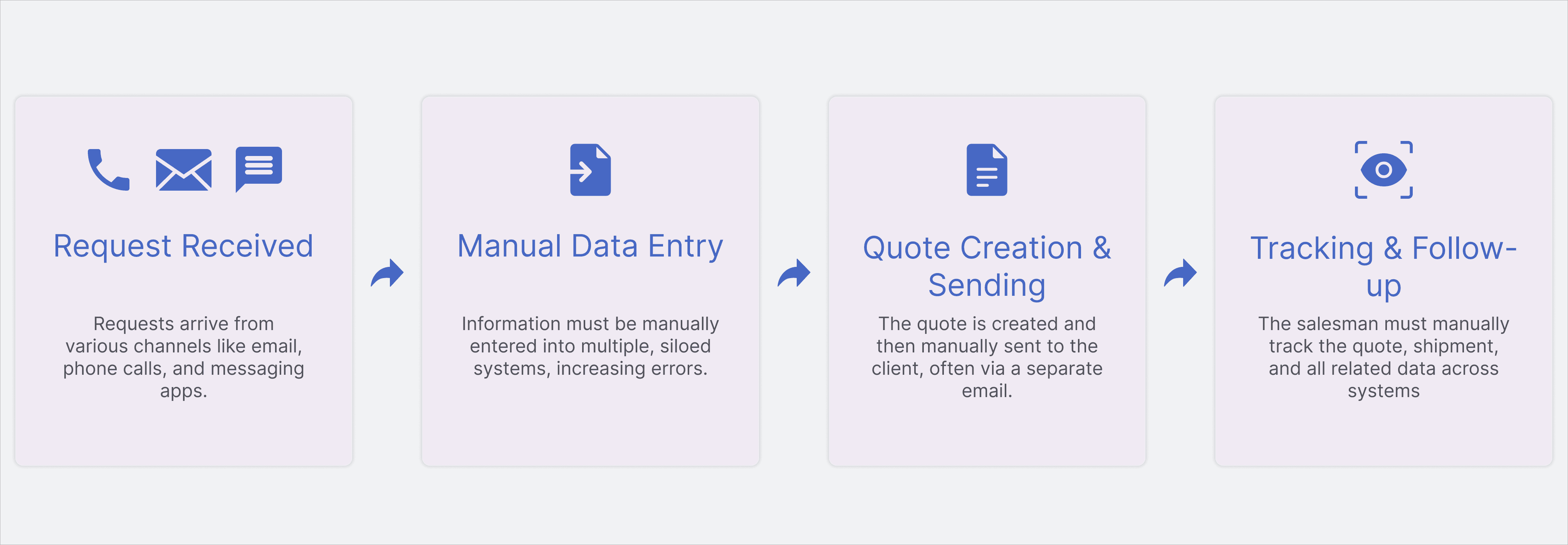 Quotes are managed across disconnected tools like emails, spreadsheets, and invoicing systems, requiring repeated manual data entry and creating high risk for errors. This fragmented, manual process leads to slow updates, misquotes, revenue leakage, and reduced customer satisfaction.